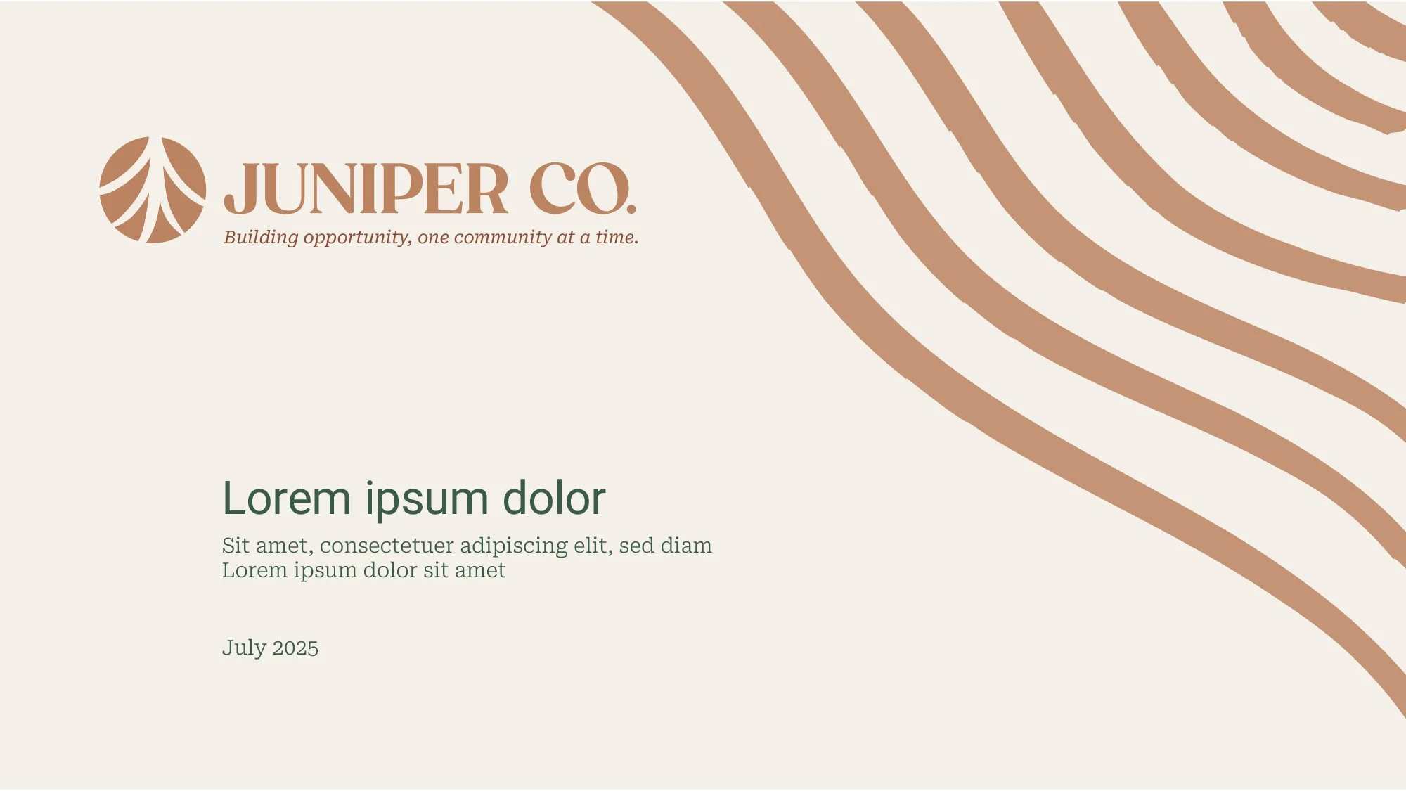 Beyond the core logo, the system includes a custom suite of branded assets, including organic patterns; a website; a flexible presentation deck template; a report layout for long-form content; and letterhead for day-to-day communication. A welcoming color palette, lived-in photography and practical typography complete the system. Juniper Co. now has a brand that feels grounded, hopeful and ready to scale impact.