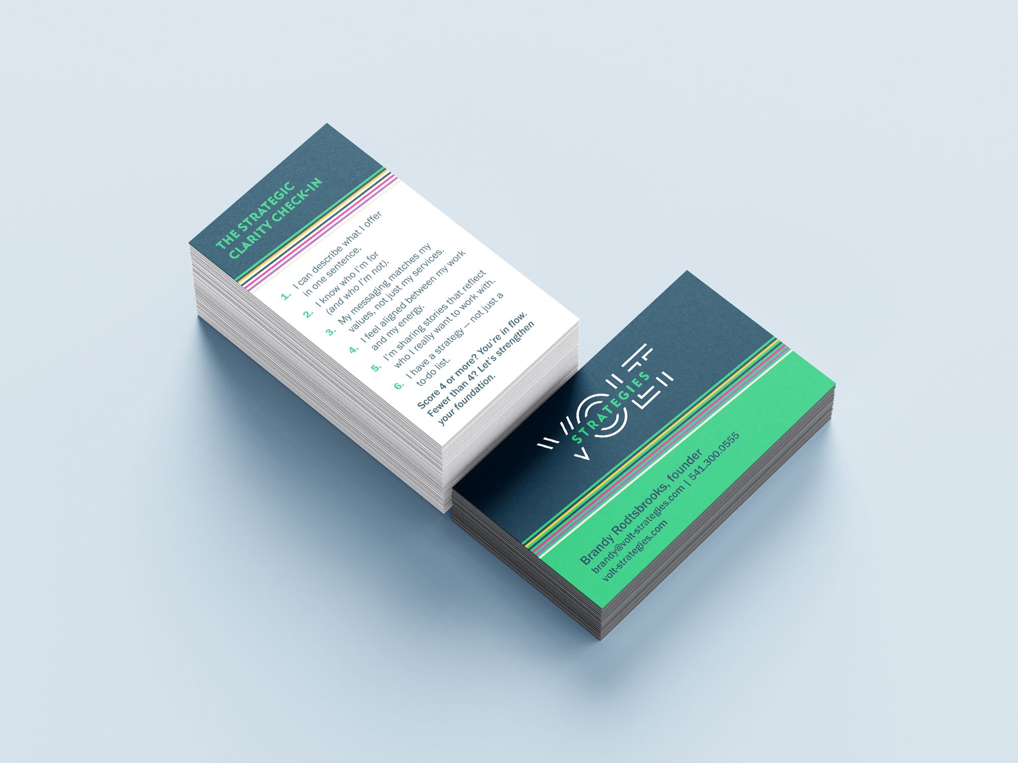 Brandy Rodtsbrooks, founder of Volt Strategies, needed a brand that matched her bold and dynamic style. We developed a logo and an overarching visual brand system that has energy and movement reflective of the change-agent nature of her business.